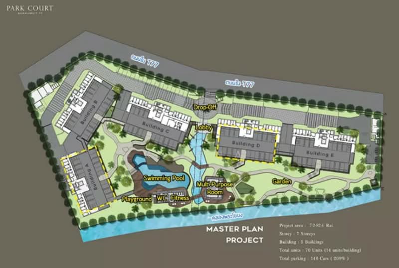 Park Court Sukhumvit 77 is a low-rise condominium set on over 7 rai, designed for large-family living with exceptional privacy. The project features 5 residential buildings, each 7 floors high with only 2 units per floor and 70 units per building. Selected units are available for freehold sale in Buildings A and D. Facilities include swimming pool, fitness center, concierge service, landscaped garden, parking, and 24-hour security. Located in a growing international neighborhood with easy access via Sukhumvit Road, On Nut Road, and Ramindra-At Narong Expressway.