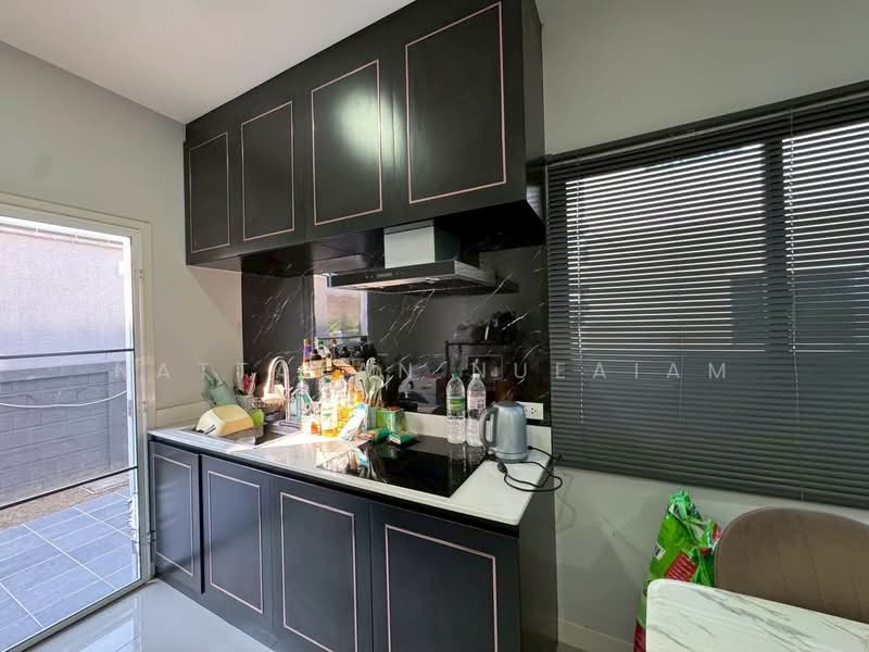 • ห้องครัว Built-in สวยงาม มีเคาน์เตอร์เตรียมอาหารและพื้นที่จัดเก็บครบ