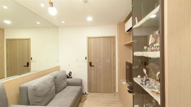 - ห้องรับแขกติดวอลเปเปอร์และติดตั้งกระจกเงาเพิ่มความกว้างของห้องพร้อมbuilt in ชั้นวางทีวีและตู้โชว์ มีโซฟา แอร์