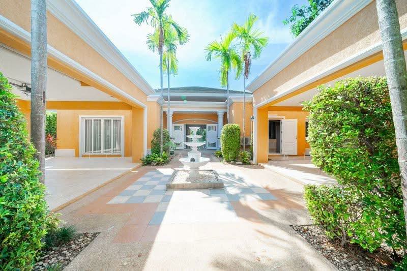 The property features 4 bedrooms and 4 bathrooms with a spacious layout designed for comfort. The villa sits on a large land size of 1050 sqm with a living area of 450 sqm, which provides plenty of space for outdoor living and relaxation. Moreover, the house is a single-storey design, making it convenient for all ages. In addition, the property is under Thai company ownership and the transfer fee is shared 50/50, which makes the purchase process more flexible.