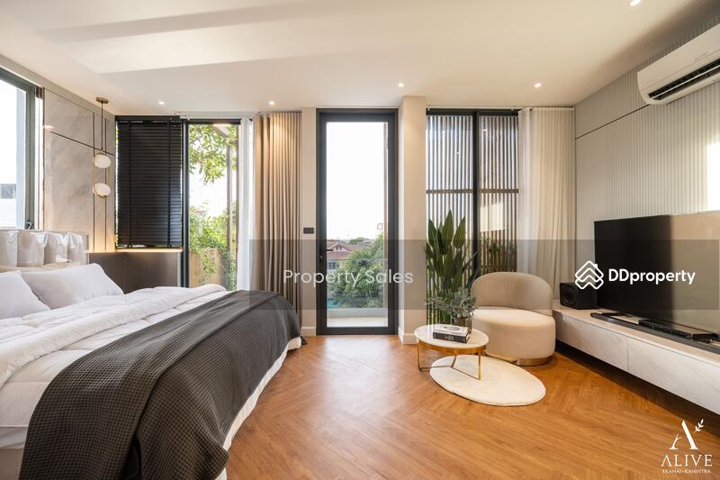 Alive Ekamai - Ramintra Luxurious 3 and a half storey semi-detached house, Modern Tropical style, located on Lat Phrao Road. Close to the Yellow Line and complete with amenities. The houses in the project are private with only 6 units. Emphasis on functions inside the house that are airy and comfortable, connected to the natural area outside the house, comes with a large Master Bedroom on the entire floor.
