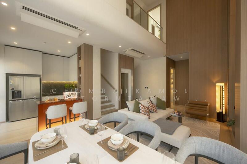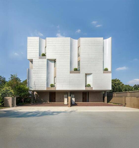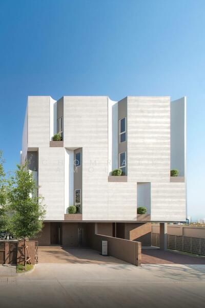This contemporary three storey freehold townhouse offers an impressive overview of space and style in Bangna, Bangkok. The home presents approximately 285 square meters of interior area on a 161.48 square meter land plot. It delivers a strong initial impression with its sculpted white facade, geometric lines, and minimalist architectural character.