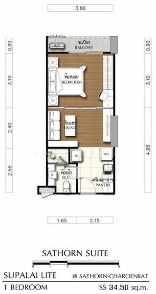 Fully furnished 1 bedroom, 1 bathroom condo for rent with a floorsize of 34.5 squaremeters, located on the 21st floor, at Supalai
