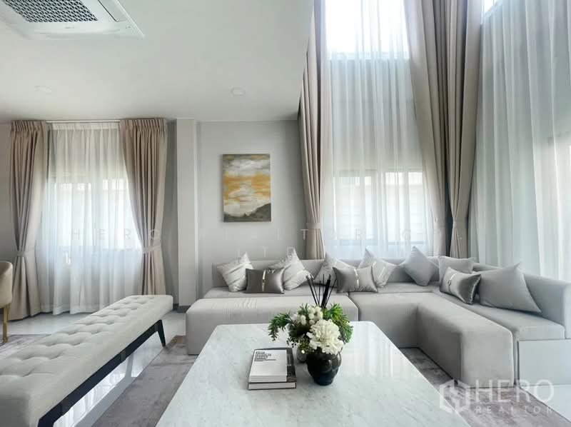 THE CITY Bangna 2 project , a large single house in an English style for you. The house has a distinctive feature of a large plot of land starting at 100 sq.w., usable area starting at 390 - 580 sq.m., near MEGA BANGNA and Concordian International School, starting price 26.9 million baht, with interesting highlights as follows: Location : The project is located on the Kanchanaphisek Ring Road, which can be accessed by a shortcut to MEGA BANGNA in just 1.5 kilometers. It is also close to Concordian International School and D-PREP International School in 1-2 kilometers, as well as the entrance and exit of 2 expressways, Kanchanaphisek Road and Burapha Withi Road, making it convenient to enter and exit the city. Common area atmosphere : The project is designed to emphasize a shady atmosphere with a large green garden and a clubhouse with high ceilings and complete functions including a fitness center, swimming pool, and an area for family activities. Suitable for those who like a common area with a good atmosphere and practical use. New house designs and usable space : This is considered a new design of THE CITY house, different from previous projects. Designed in the English Tudor Architecture style, it is unique with a high gable shape, emphasizing black and white tones, decorated with bricks and wood. There are 4 house designs, emphasizing starting usable space of 390 - 580 square meters, supporting up to 5 bedrooms.