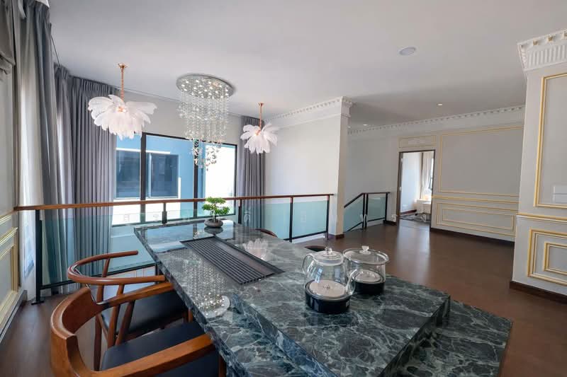 Featuring top-tier Italian designer furniture, including a handcrafted Italian “piano-key” sofa, Persian carpets, Prada green luxury stone tea table, tassel crystal chandeliers, Edra petal bed, grand crystal chandeliers, oversized peacock sculpture, fireplace feature wall, and a 4-meter statement wall art.