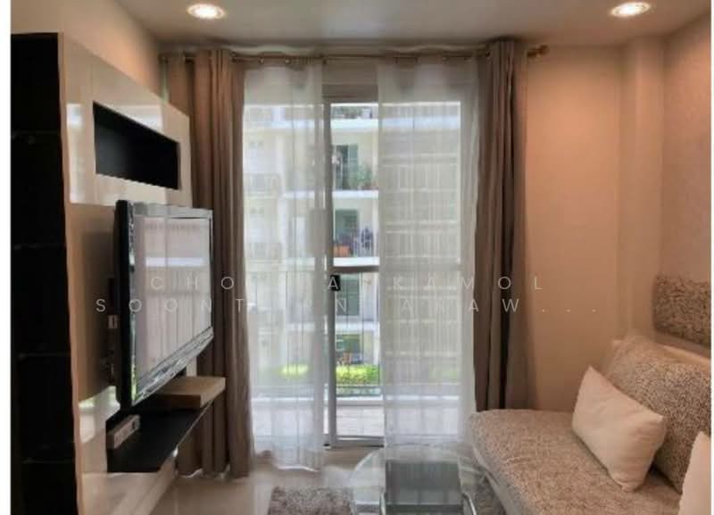 This fully furnished 45 sqm one-bedroom condo boasts a sleek and sophisticated design. The living room features a comfortable sofa with patterned finishes, a wall-mounted TV, and a glass coffee table, offering a great space for relaxation. Large windows with sheer curtains allow natural light to flood the space, complementing the neutral color palette and creating a warm ambiance. Recessed lighting adds a modern touch, enhancing the cohesive decor.