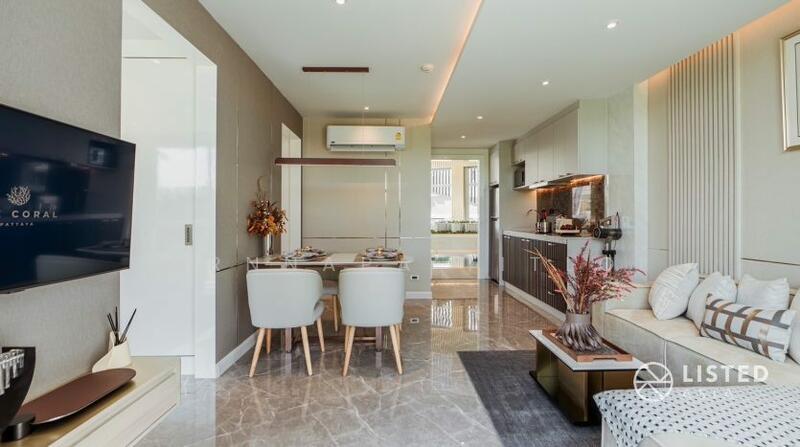2 Bedrooms 2 Bathrooms Condo for Sale at The Coral Pattaya. Available in Foreign/Thai Name Ownership. Offering 55.14 Sqm of living area and located on the 6th floor. It comes full furnished, built-in European kitchen, fridge, microwave, electric hob, living area with sofa and TV, dining area, fitted furniture, built-in wardrobe, en-suite bathroom and balcony with pool view.