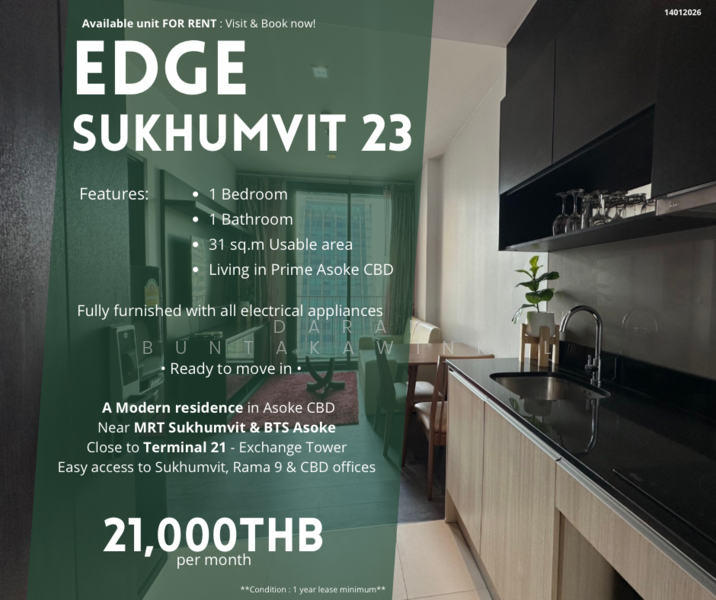 Highrise condominium in Sukhumvit area starting price lower than 5 million EDGE Sukhumvit 23 is a 35-storey high rise condominium with 443 units, located on 2 rai 2 ngan 17 sq.w. Convenient location, close to MRT Sukhumvit Station and BTS Asoke. EDGE Sukhumvit 23 is located on Sukhumvit Road. Which is the focus of many people. The EDGE Sukhumvit 23 project is priced at 4.49 million baht. EDGE Sukhumvit 23 is a very attractive project. Meet the needs of urban style residents with potential locations around. Just 300 meters from Asoke BTS Skytrain Station and 350 meters from MRT Sukhumvit Station, it is surrounded by all facilities. Various shopping malls such as Terminal 21, Emporium Shopping Center And within the EDGE Sukhumvit 23 project, there are also many internal amenities that you need to touch. EDGE Sukhumvit 23 is a condominium on a prime location. Sukhumvit Sukhumvit 23 is located on Sukhumvit 23, behind the Jasmine Tower. The EDGE Sukhumvit 23 is just 300 meters from Asoke BTS Skytrain Station and 350 meters from Sukhumvit MRT Station. The EDGE Sukhumvit 23 is also within easy reach. The unique design. The life of the city. EDGE Sukhumvit 23 is a 443-unit high-rise condominium, designed in the Y & R Generation (Young & Restless Generation) style with round-the-clock facilities. The exterior of EDGE Sukhumvit 23 is also close to department stores such as Terminal 21 and Emporium. There are convenience stores in Soi 7-11 and close to the EDGE Sukhumvit 23. There are many restaurants and a la carte restaurants in the neighborhood. The EDGE Sukhumvit 23 is fully equipped with superior facilities. There is a large swimming pool. There is a well-equipped gym. EDGE Sukhumvit 23 is a good choice for those who want to live in the city. Travel by train Arrive at EDGE Sukhumvit 23 , take BTS station to Asoke station and then walk 300 meters to Sukhumvit 23, you will find the EDGE Sukhumvit 23 very clearly or go with any MRT station. At Sukhumvit Station Then walk across the street for another 350 meters to Sukhumvit 23, you will find EDGE Sukhumvit 23. Travel by car EDGE Sukhumvit 23 is not difficult to reach. Ratchadapisek Road to go straight until Come down Sukhumvit Road and turn right. Then look for Soi Sukhumvit 23 where you will find EDGE Sukhumvit 23. EDGE Sukhumvit 23 is located in Sukhumvit. The main street of the main business district connects to many other roads and has many facilities. Do not worry about the food in the neighborhood around the project. EDGE Sukhumvit 23 has 7-11 convenience stores that can walk away. There is also a restaurant named Subway, a restaurant with branches around the world, near the EDGE Sukhumvit 23, only 90 meters away, there is a ramen shop, Tonkotsu Kazan Ramen is a Japanese style restaurant, just 120 meters away. Not to be missed in this bustling neighborhood, it's a must-have hangout, not to mention the Crazy House, a trendy bar for beer lovers and live music. EDGE Sukhumvit 23 is only 70 meters away. Project Name: EDGE Sukhumvit 23 (Edgewater Sukhumvit 23) Project developer: SANSIRI - Sansiri Public Company Limited Location: 6 Soi Sukhumvit 23, Klongtoey Nua, Wattana, Bangkok 10110 Condo Near BTS: MRT Sukhumvit Station 350 meters BTS BTS Asoke Station only 300 meters Project Area: Approximately 2-2-17 Rai Project Type: 35-storey high-rise condominium units totaling 443 units. Construction Status: Completed Ready Year of construction: 2559 Facilities: Car Parking, Elevator, Reception Hall, Mailroom, Meeting Room, Living Room, Garden, Social Club, Swimming Pool, Gym Security: Security 24 hrs. And CCTV around the project. Starting Price: 4,490,000 Million Baht Room Type 1 Bedroom 29.50 - 43.00 sq.m. 2 Bedrooms 60.00 - 69.50 sq.m. For those who are interested in EDGE Sukhumvit 23 condo project, please refer to the list of EDGE Sukhumvit 23 condo listings or EDGE Sukhumvit 23 condo listings. Ashton Asoke Life Asoke Asoke Place Condominium THE ADDRESS Asoke (The Address Asoke) Supalai Premier Place Asoke RHYTHM Asoke 2: Rut Asoke 2 CASA CONDO Asoke - Din Daeng