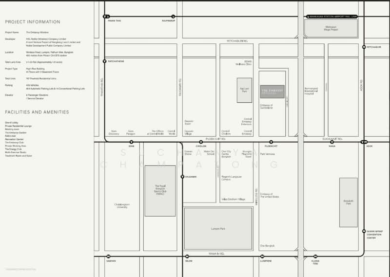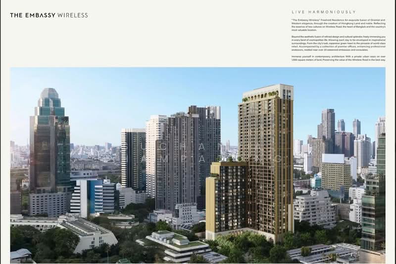 ดิ เอ็มบาสซี่ ไวร์เลส (The Embassy Wireless) โครงการคอนโดมิเนียม High Rise 41 ชั้น จำนวน 1 อาคาร ใกล้กับเซ็นทรัล เอ็มบาสซี ประมาณ 270 เมตร และใกล้กับรถไฟฟ้า BTS สถานีเพลินจิต ประมาณ 400 เมตร เป็นผลงานการพัฒนาโครงการจากบริษัท เอชเคแอล โนเบิล (ไวร์เลส) จำกัด โครงการนี้มีเนื้อที่ทั้งหมดประมาณ 3 ไร่ 1 งาน 32.9 ตารางวา จำนวน 757 ยูนิต พื้นที่ใช้สอยตั้งแต่ 35-70 ตารางเมตร ขนาด 1-2 ห้องนอน 1-2 ห้องน้ำ พร้อมสิ่งอำนวยความสะดวก เช่น ห้องออกกำลังกาย, สระว่ายน้ำ, สวนสาธารณะ และระบบรักษาความปลอดภัยได้มาตรฐาน เป็นต้น โดยโครงการนี้คาดว่าจะก่อสร้างแล้วเสร็จในปี 2570 และมีลักษณะการถือครองแบบขายขาด ตัวโครงการตั้งอยู่บนถนนวิทยุ ไม่ไกลจากแหล่งอำนวยความสะดวก โดยในรัศมีไม่เกิน 5 กิโลเมตรรอบโครงการ จะพบสถานที่น่าสนใจ เช่น เซ็นทรัล เอ็มบาสซี, เซ็นทรัล ชิดลม, สยามพารากอน, โรงเรียนเตรียมอุดมศึกษา, มหาวิทยาลัยศรีนครินทรวิโรฒ ประสานมิตร, โรงเรียนสาธิตมหาวิทยาลัยศรีนครินทรวิโรฒ ประสานมิตร ฝ่ายมัธยม, โรงเรียนนานาชาติออสเตรเลีย, โรงพยาบาลบำรุงราษฎร์ อินเตอร์เนชั่นแนล, โรงพยาบาลจุฬาลงกรณ์ และโรงพยาบาลพญาไท 1 เป็นต้น การเดินทางเข้าออกโครงการ สามารถใช้ถนนเพลินจิต ห่างจากโครงการประมาณ 400 เมตร, ถนนราชดำริ ห่างจากโครงการประมาณ 1.5 กิโลเมตร, ถนนพระรามที่ 1 ห่างจากโครงการประมาณ 2 กิโลเมตร และถนนพญาไท ห่างจากโครงการประมาณ 2.7 กิโลเมตรได้ และจะพบทางพิเศษเฉลิมมหานครในระยะทางประมาณ 600 เมตร ให้ใช้บริการด้วย ดิ เอ็มบาสซี่ ไวร์เลส (The Embassy Wireless) ออกแบบภายใต้แนวคิด Live Harmoniously ให้ความสำคัญกับการใช้ชีวิตอย่างกลมกลืนของวัฒนธรรมตะวันออกและตะวันตก ซึ่งสื่อถึงเจ้าของโครงการอย่างฮ่องกง แลนด์ และโนเบิลได้อย่างชัดเจน คุมโทนตัวอาคารด้วยสีทอง สีขาว และสีดำ มีการใช้เส้นตรงและเส้นโค้งมน ผสมผสานกันอย่างลงตัว ดีไซน์มีความหรูหราและทันสมัย สื่อถึงความสง่างามเหนือกาลเวลา พร้อมโอเอซิสใจกลางเมือง พื้นที่สีเขียวขนาดใหญ่ของโครงการ ที่ให้บรรยากาศร่มรื่น และการตกแต่งอันประณีต พร้อมสร้างแรงบันดาลใจให้ผู้อยู่อาศัยได้ทุกวัน ภายในห้องเน้นพื้นที่ใช้สอยที่กว้างขวาง โปร่งสบาย ผสมผสานฟังก์ชันการใช้งานที่ลงตัว ใช้กระจกเต็มบานในการตกแต่ง เพื่อเปิดรับแสงธรรมชาติ และช่วยให้มองเห็นทิวทัศน์ของเมืองได้ ตกแต่งโดยนำความเป็นตะวันออกและตะวันตกเข้าไว้ด้วยกัน โดยใช้โทนสีอบอุ่น มีการใช้วัสดุธรรมชาติ และเส้นสายที่เรียบง่าย ทำให้มีความเรียบหรูและทันสมัย โดยแบบห้องในโครงการมีทั้งหมด 3 แบบด้วยกัน คือ 1 Bedroom พื้นที่ใช้สอย 35 ตารางเ