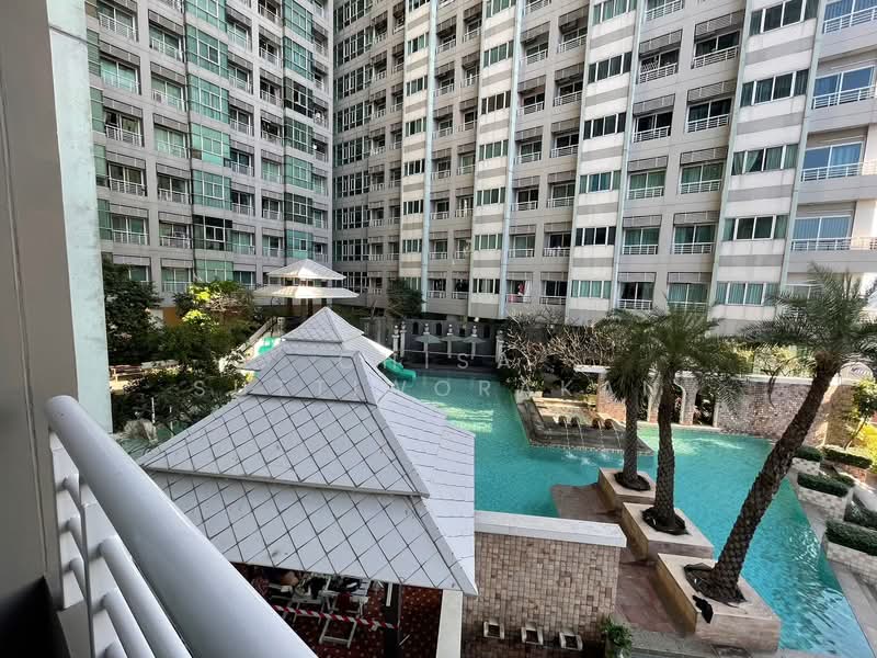 ระเบียงมองเห็นสระว่ายน้ำขนาดใหญ่และสวน