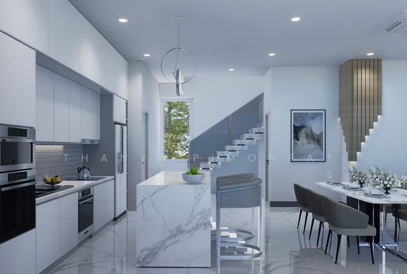 The open-concept living area creates a seamless flow between the kitchen, dining, and living spaces, making it ideal for entertaining or simply relaxing with family. Large windows throughout the villa invite natural light, creating an airy and bright atmosphere, while also offering picturesque views of the surrounding landscape.