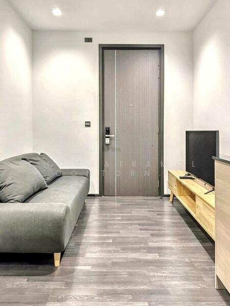 The 29 sqm condo features a thoughtfully designed living space. The living room is elegantly furnished with a gray sofa, flat-screen TV, and a wooden TV stand, complemented by dark wood flooring and minimalist decor.