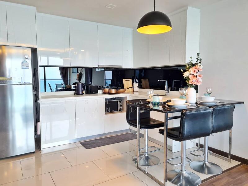 The master bedroom includes an en-suite bathroom with a bathtub, providing a luxurious retreat, while the second bedroom is well-appointed with easy access to the second bathroom. The expansive balcony is perfect for relaxing and enjoying the panoramic views of the coastline.
