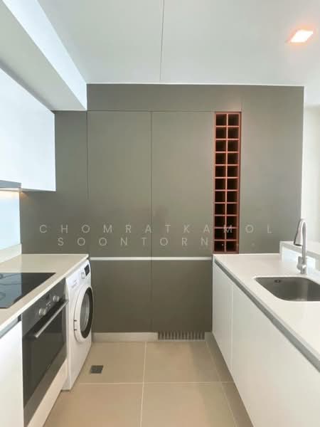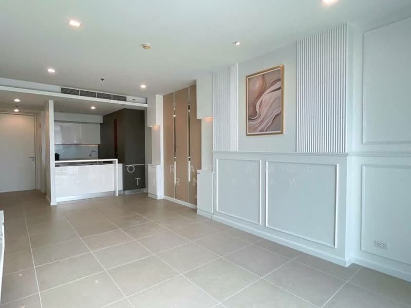 This 69 square meter one bedroom condo offers a bright open-plan layout on the 11th floor of The River Condominium in Khlong Ton Sai, Khlong San, Bangkok. The residence is sold freehold and is fully furnished in a modern minimalist style with a neutral color palette.
