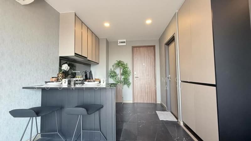 This modern 1-bedroom condo offers 35.53 square meters of functional space on the 3rd floor of The Teak Ratchada 19 in Chomphon, Chatuchak, Bangkok. The home is fully furnished and presented in a contemporary neutral style. Large windows provide an immediate sense of light and openness on entry.