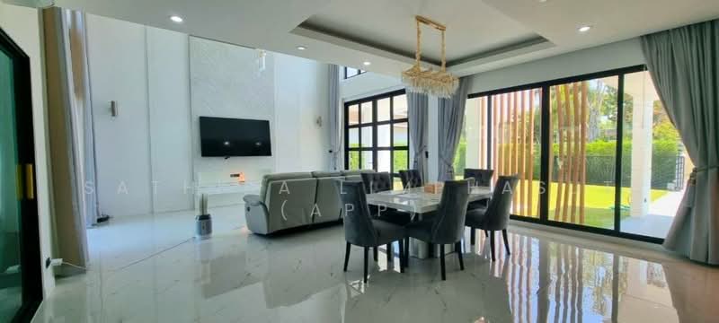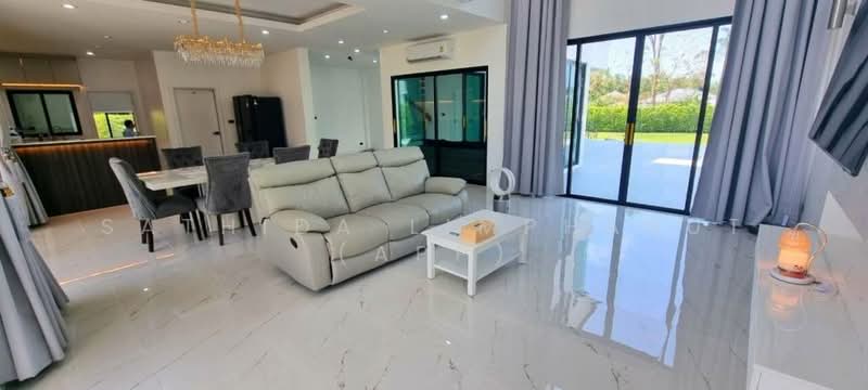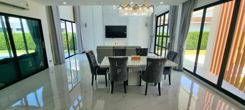 This is 2 Stoery House 4 Bedrooms, 4 Bathrooms for Sale in Mabprachan. Is Available in Thai Name Ownership, sitting on 976 Sqm of land plot size, 550 Sqm of useable area, comes full furnished, European kitchen, dining table, refrigerator, open plan living area, comfortable sofa, flat screen TV, sizeable bedrooms, walk-in closet, en-suite bathroom, large garden, and covered car park.