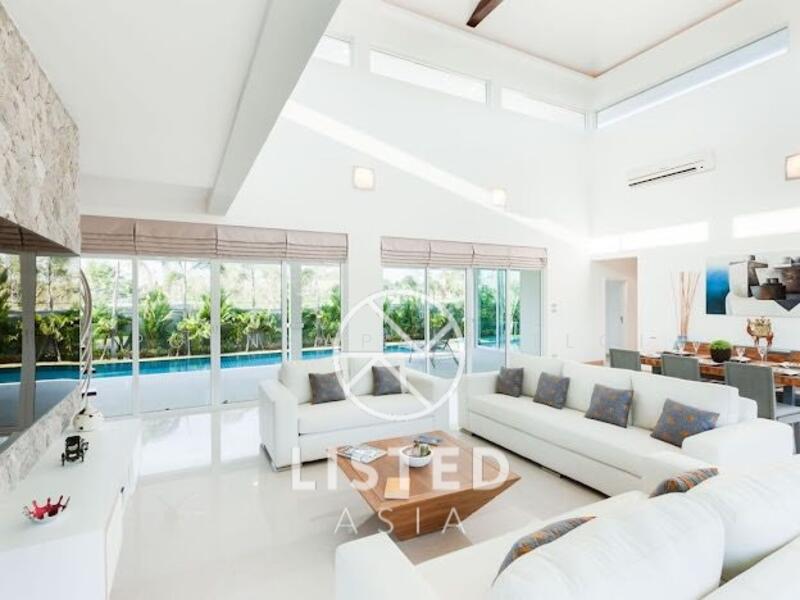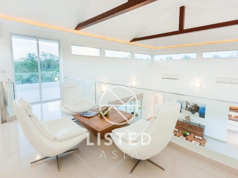 3 Bedroom 3 Bathroom Pool Villa for Sale in Map Prachan, set on a land plot of 882 sq.m. and a living area of 270 sq.m. The property comes fully furnished and features an en-suite European kitchen, an open-plan living area with comfortable sofas and TV, and modern amenities throughout the home.