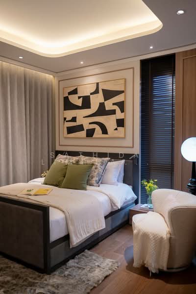 Upstairs, the bedrooms are designed for privacy and comfort, each with an en-suite bathroom. The master suite includes a large balcony, a walk-in wardrobe, and a luxurious bathroom with high-end fixtures.