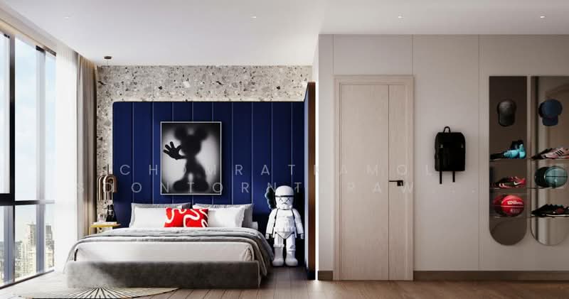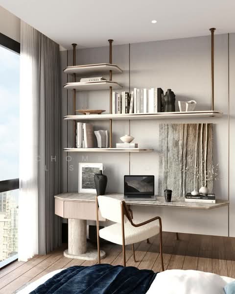 Designed for modern living, the condo features a spacious living area, dining area, and a fully equipped kitchen with high-end appliances, including a refrigerator and cooking range. The master bathroom boasts a luxurious bathtub, perfect for relaxation. Each room is meticulously designed to maximize comfort and style.