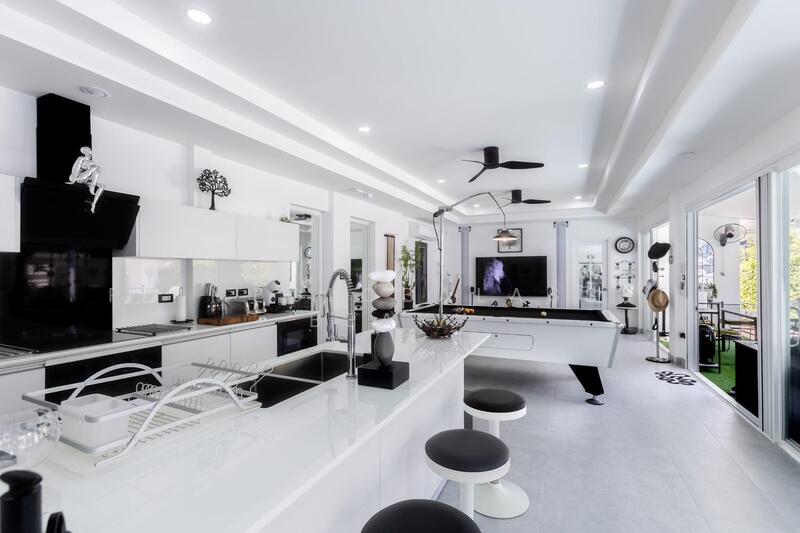 An open plan living area with western style kitchen with fully appliances (Electric Hob, Hood, Oven, Microwave, Refrigerator, Dishwashing machine, BBQ grill)
