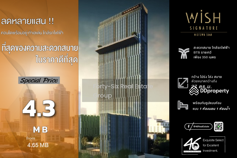 Highrise condominium project in Ratchathewi area Wish Signature Midtown Siam is a freehold project developed by Siam Nut Co., Ltd., located on Petchaburi Road. (Soi Petchaburi 20), Ratchathewi, Ratchathewi, Bangkok The building is a 45-story high rise building on an area of 2-3-60 rai. The total number of units in the project is 623 units, consisting of three types of rooms: 1 bedroom (27.16 - 34.83 sq.m.) 2 Bedrooms (41.78 - 68.88 sq.m.) and 3 Bedrooms (92.14 sq.m.). Wish Signature Midtown Siam is a completed project from 2017 ready to move in. Wish Signature Midtown Siam has many amenities such as Family Pool and Sky Pool, library, movie room, sauna, fitness room, Sky Lounge, Grand Amphitheater, private elevator, parking and complete security system. It is an Access Key Card, security guard. CCTV 24 hours Wish Signature Midtown Siam is close to shopping centers such as Pantip Pratunam (300 m), The Platinum Fashion Mall (500 m), Siam Paragon (600 m), Central World (1.1 km. Wish Signature Midtown Siam is also close to hospitals and educational institutions such as Police Hospital (1.9 km), King Chulalongkorn Hospital (3.3 km), Siam Singapore International School (850 m) , Prep school (1.8 km), Chulalongkorn University (1.9 km), etc. Wish Signature Midtown Siam on Phetchaburi Road It is convenient for both public transportation and private car. It is only 450 meters away from BTS Ratchathewi station and only 1 station at Phayathai station. It is connected to the Airport Rail Link, easy to travel to Ramkhamhaeng and Suvarnabhumi. If you want to use your own car, you can take Phetchaburi Road at the front of the project to Pratunam, Pratunam, Rama 9, Ratchadapisek, Asoke and connect to Sukhumvit Rama IV Rama III. Including travel to the inner city. On Larn Luang Road, continue to Samsen Nai Pranak District and cross the Chao Phraya River to the Thonburi side using the Rama 8 Bridge, Somdej Phra Pinklao Bridge. It can do the same.