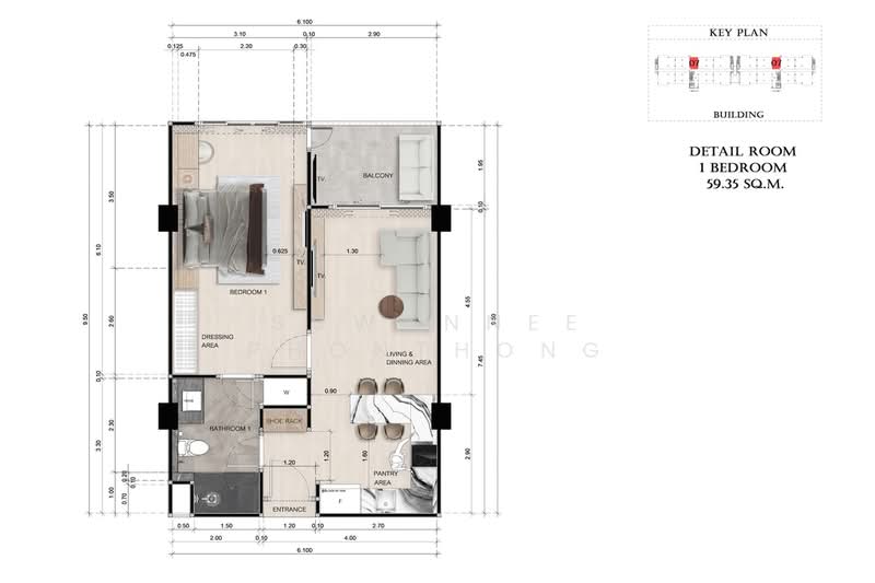 Floor size of this unit at Zensiri Jomtien Residences is 59 sqm.