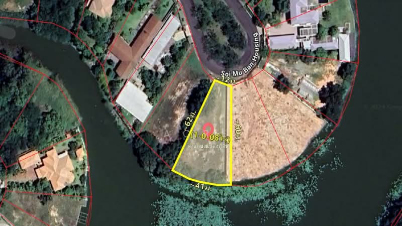 หน้ากว้างที่ดิน 12 เมตร ลึก 62 เมตร ด้านหลังติดน้ำกว้าง 41 เมตร