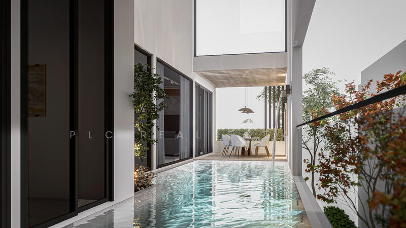 สระว่ายน้ำส่วนตัวสร้างบรรยากาศผ่อนคลายสำหรับการพักผ่อนหย่อนใจ นอกจากนี้ พื้นที่กลางแจ้งยังเพิ่มมูลค่าให้กับการใช้ชีวิตประจำวันพร้อมทั้งรักษาความเป็นส่วนตัว ในขณะเดียวกัน ที่จอดรถสำหรับสามคันก็ช่วยให้ใช้งานได้อย่างสะดวกสบาย