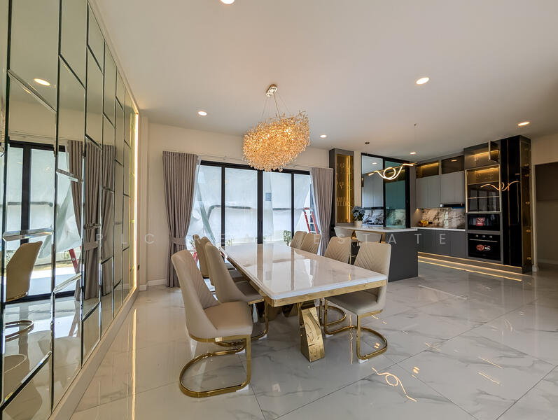พื้นที่นั่งเล่นและรับประทานอาหารแบบเปิดโล่งเชื่อมต่อกับระเบียงกลางแจ้งและสระว่ายน้ำส่วนตัวได้อย่างลงตัว สร้างสรรค์ไลฟ์สไตล์ที่กลมกลืนระหว่างภายในและภายนอกบ้าน ประตูกระจกบานเลื่อนขนาดใหญ่ช่วยให้แสงธรรมชาติส่องเข้ามาภายใน พร้อมทั้งมองเห็นวิวสระว่ายน้ำได้อย่างชัดเจน