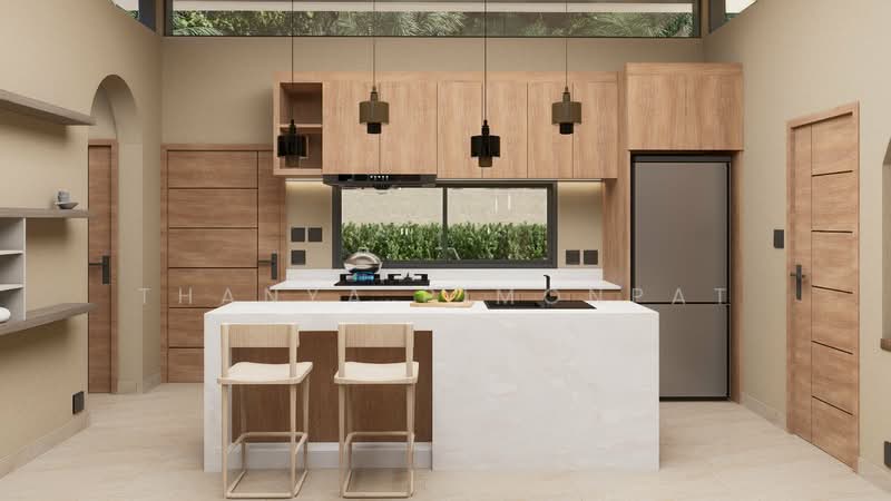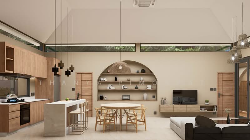 ภายในบ้านมีพื้นที่นั่งเล่นและรับประทานอาหารแบบโอเพ่นแพลน เชื่อมต่อกับห้องครัวทันสมัย ทำให้บ้านโปร่งสบายและเหมาะสำหรับทั้งการใช้ชีวิตประจำวันและการต้อนรับแขก ห้องนอนทุกห้องมาพร้อมห้องน้ำในตัว เพิ่มความสะดวกสบายและความเป็นส่วนตัว หน้าต่างบานใหญ่เปิดรับแสงธรรมชาติและเชื่อมต่อกับบรรยากาศเขียวชอุ่มรอบ ๆ บ้าน