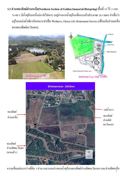 1.2 ส่วนทองทิพย์ทิศตะวันออก(Hotspring Wellness Area) 80 ไร่ มีน้ำพุร้อน 2 บ่อ เจาะแล้ว 1 บ่อ ติดถนนคอนกรีต 3 ด้าน ติดแม่น้ำลาว 206 เมตร
