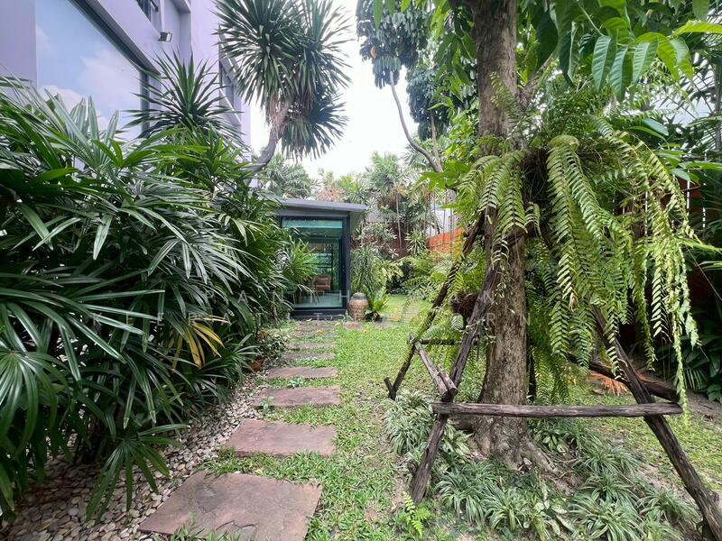 ขนาดที่ดิน 79.5 ตารางวา หน้ากว้าง 14 เมตร ลึก 21 เมตรพื้นที่ใช้สอยรวม 400 ตารางเมตร โครงสร้างแข็งแรงมาก ภายในโอ่โถง อากาศถ่ายเทได้ดี ต่อเติม glass house บริเวณสวนด้านข้างบ้าน บรรยากาศร่มรื่น (หน้าบ้านทิศตะวันออก)
