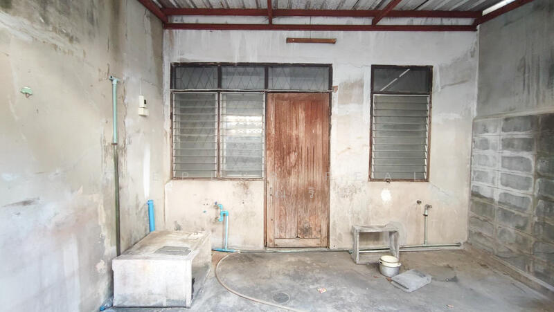 ชั้นล่าง : ด้านหน้าบ้านต่อเติมหลังคาโรงจอดรถ ภายในบ้านพื้นปูด้วยกระเบื้อง ด้านหลังบ้านเป็นลานซักล้าง