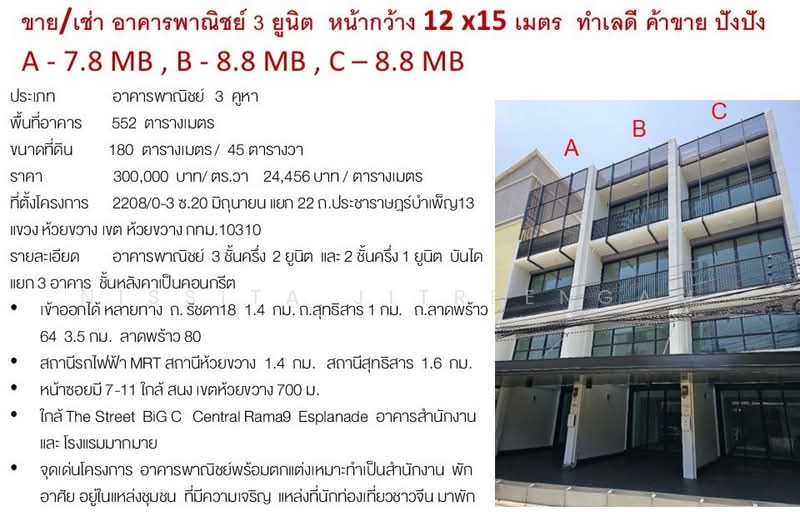 อาคารย์ พาณิชย์ 3 ยูนิต หน้ากว้าง 12x15 เมตร ทำเลดี ห้วยขวาง