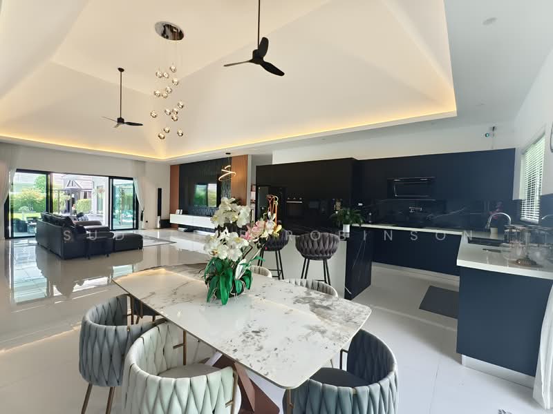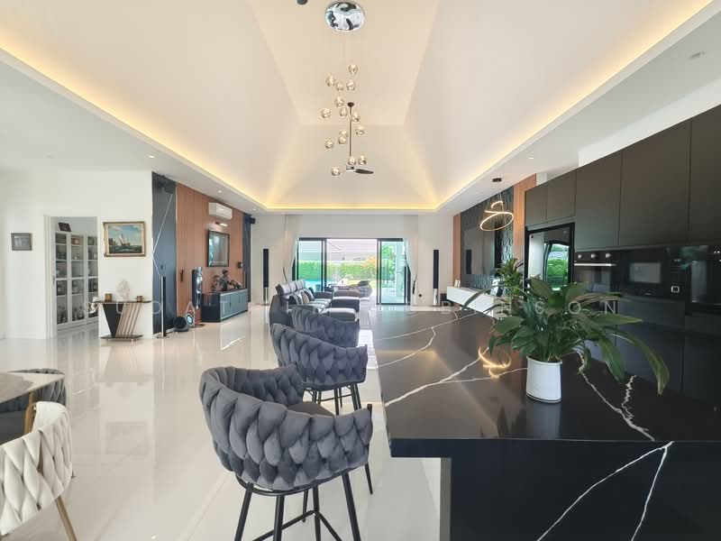 พื้นที่นั่งเล่นและรับประทานอาหารแบบเปิด พร้อมครัวยุโรปและเคาน์เตอร์ไอส์แลนด์ ประตูบานเลื่อนเปิดสู่ระเบียงและสระว่ายน้ำ