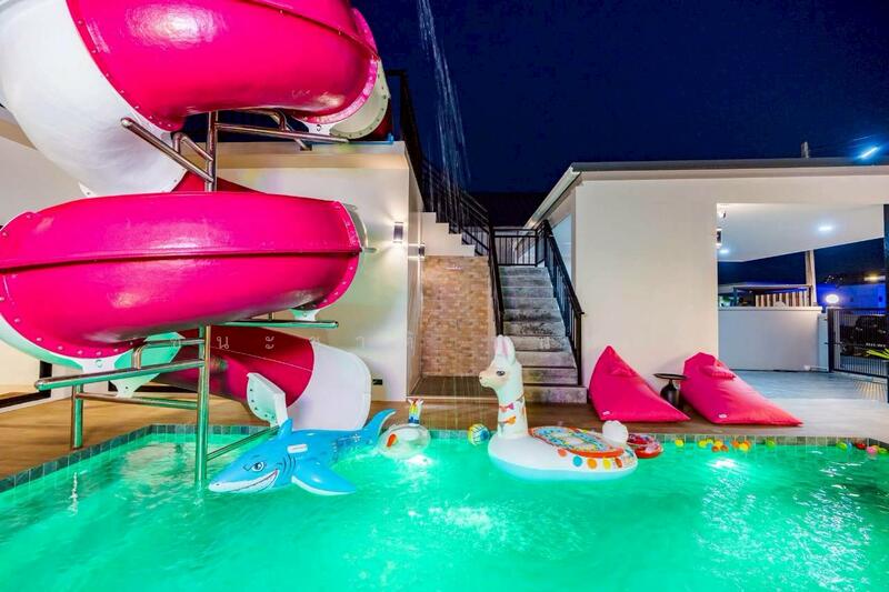 การตกแต่ง : บ้านขนาดใหญ่ มีฟื้นที่ใช้สอยเยอะ สิ่งอำนวยความสะดวกครบครัน มีสระว่ายน้ำระบบเกลือ สไลเดอร์ขนาด15เมตร รองรับผูเข้าพักได้ถึง 12-18 ท่าน Pet friendly มีบ้านน็อคดาวหลังเล็กอีก1หลัง โต๊ะพลู คาราโอเกะ เดินทางง่ายใจกลางเมือง วิวเขาใกล้ทะเล(1กิโลเมตร)