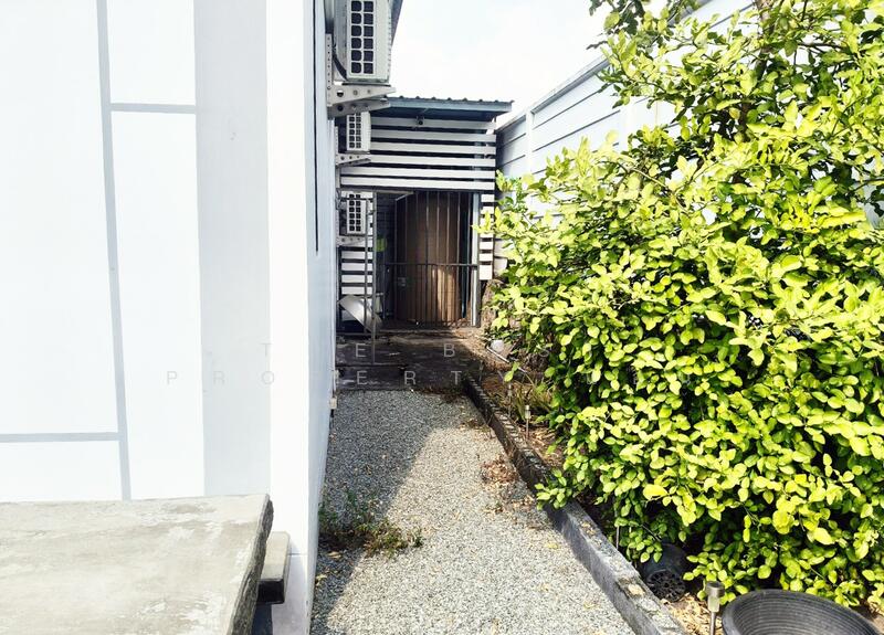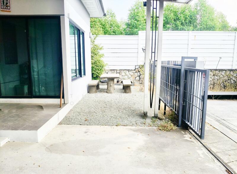 บ้านมีประตูบานเลื่อนมุ้งจีบ พื้นที่นั่งเล่นหน้าบ้าน พื้นที่ข้างบ้านทำสวนหย่อมได้