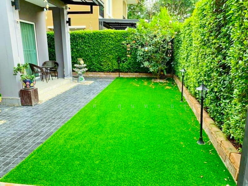 จอดรถ 2 คัน พร้อมเฟอร์นิเจอร์ ต่อเติมโรงรถและครัวปิดหลังบ้าน ลงเสาเข็มตามมาตรฐาน ตกแต่งสวนด้วยหญ้าเทียม ปูพื้นทางเดิน พร้อมโคมไฟสนามรอบบ้าน กำแพงไม้ระแนงรอบบ้าน ปลูกไทรเกาหลี เพิ่มความร่มรื่น และความเป็นส่วนตัว ติดตั้งประตูรั้วอัตโนมัติ ควบคุมด้วยรีโมท และโทรศัพท์ ใช้งานสะดวก ปลอดภัย