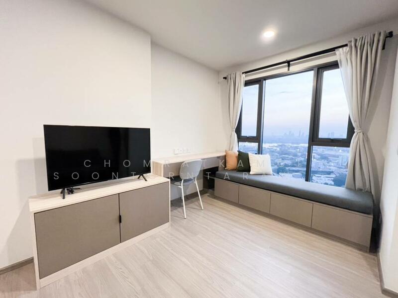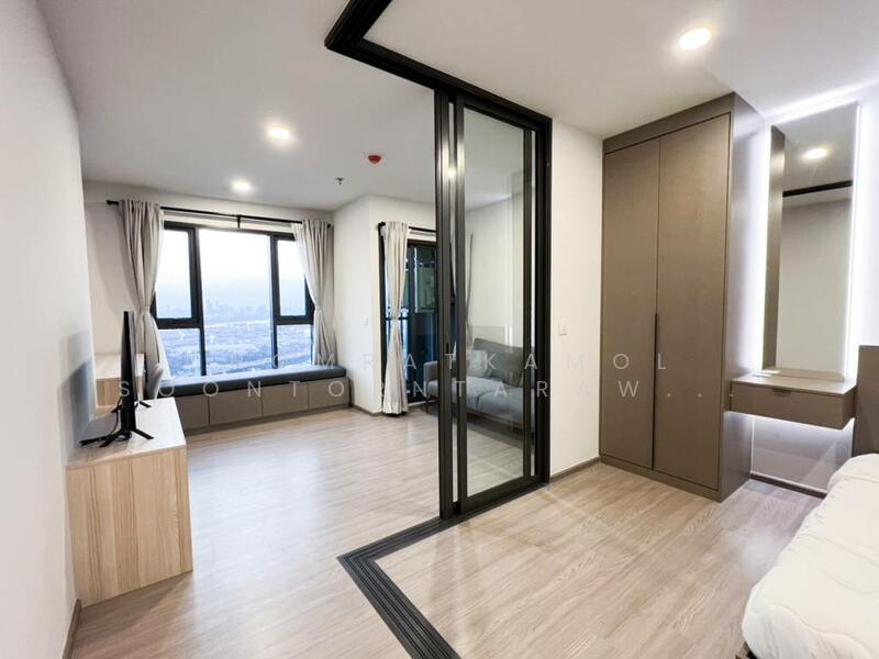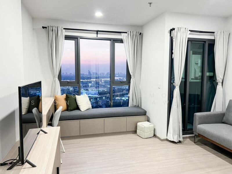 This modern 1-bedroom condo offers a bright high-floor living space in Aspire Sukhumvit-Rama 4. The unit measures 35 square meters and sits on the 30th floor of a 38-floor building with city skyline and sunset views.