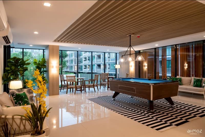 แอทโมซ ลาดพร้าว 71 (Atmoz Ladprao 71) โครงการคอนโดมิเนียม Low Rise 8 ชั้น จำนวน 4 อาคาร ตั้งอยู่ใกล้กับรถไฟฟ้าสายสีเหลือง สถานีโชคชัย 4 ประมาณ 3.7 กิโลเมตร เป็นผลงานการพัฒนาโครงการจากบริษัท แอสเซทไวส์ จำกัด (มหาชน) โครงการนี้มีเนื้อที่ทั้งหมดประมาณ 7 ไร่ 93.2 ตารางวา จำนวน 740 ยูนิต มีพื้นที่ใช้สอยตั้งแต่ 23.85-54.32 ตารางเมตร ขนาด 1-2 ห้องนอน 1 ห้องน้ำ พร้อมสิ่งอำนวยความสะดวก เช่น สระว่ายน้ำ ห้องออกกำลังกาย และระบบรักษาความปลอดภัยที่ได้มาตรฐาน เป็นต้น โดยโครงการนี้ก่อสร้างแล้วเสร็จในปี 2563 และมีลักษณะการถือครองแบบขายขาด ตัวโครงการตั้งอยู่บนถนนนาคนิวาส ไม่ไกลจากแหล่งอำนวยความสะดวก ในรัศมีไม่เกิน 9 กิโลเมตรรอบโครงการ จะพบสถานที่น่าสนใจ เช่น เซ็นทรัล อีสต์วิลล์, คริสตัลพาร์ค, บิ๊กซี ลาดพร้าว, มหาวิทยาลัยราชภัฏจันทรเกษม, โรงเรียนหอวัง, มหาวิทยาลัยเซนต์จอห์น, โรงเรียนเซนต์จอห์น, โรงพยาบาลเปาโล โชคชัย 4, โรงพยาบาลลาดพร้าว และโรงพยาบาลเวชธานี เป็นต้น การเดินทางเข้าออกโครงการ สามารถใช้ถนนสังคมสงเคราะห์ห่างจากโครงการประมาณ 2.4 กิโลเมตร, ถนนประเสริฐมนูกิจ ห่างจากโครงการประมาณ 2.8 กิโลเมตร, ถนนลาดพร้าว ห่างจากโครงการประมาณ 3.5 กิโลเมตร และถนนรัชดาภิเษก ห่างจากโครงการประมาณ 4.5 กิโลเมตรได้ และจะพบทางพิเศษฉลองรัช ในระยะทางประมาณ 4.4 กิโลเมตร ให้ใช้บริการด้วย แอทโมซ ลาดพร้าว 71 (Atmoz Ladprao 71) ออกแบบมาอย่างพิถีพิถัน ภายใต้แนวคิด Urban Refresh เพื่อสร้างบรรยากาศที่สดชื่นและผ่อนคลายท่ามกลางความวุ่นวายในเมืองที่ผู้อยู่อาศัยต้องเจอทุกวัน ให้ความสำคัญกับการออกแบบพื้นที่ส่วนกลางและสิ่งอำนวยความสะดวกให้ตอบโจทย์ไลฟ์สไตล์คนเมืองที่ต้องการพักผ่อนอย่างเต็มที่ อีกทั้งยังมีพื้นที่สีเขียวรายล้อมโครงการ ซึ่งทั้งหมดนี้ถูกออกแบบมาเพื่อให้ผู้อยู่อาศัยได้ชาร์จพลังบนพื้นที่ส่วนตัวอย่างแท้จริง โดยเฉพาะมุมสระว่ายน้ำของโครงการจะติดกับบึงน้ำสาธารณะขนาดใหญ่ ให้ผู้อยู่อาศัยได้พักผ่อนท่ามกลางบรรยากาศที่ผ่อนคลายและมองเห็นวิวทะเลสาบได้ทุกวัน การตกแต่งภายในห้องของโครงการนี้ เน้นความเรียบง่าย อบอุ่น และผ่อนคลาย มีความสูงฝ้าเพดาน 2.4 เมตร ฉาบเรียบผนังสีขาว และปูพื้นด้วยลายไม้สีน้ำตาลอ่อน เน้นความโปร่งสบายและการใช้แสงธรรมชาติให้มากที่สุด พื้นที่ใช้สอยภายในห้องมีขนาดพอเหมาะ ฟังก์ชันการใช้งานครบครัน ออกแบบมาให้มีความยืดหยุ่น สามารถปรับเปลี่ยนฟังก์ชันการใช้งานได้ตามความต้องการของผู้อยู่อาศัยได้โดยแบบห้องในโครงการมีทั้งหมด 4 แบบด้วยกัน คือ 1 BEDROOM พื้นที่ใช้สอย 23.85-25.71 ตารางเมตร ขน