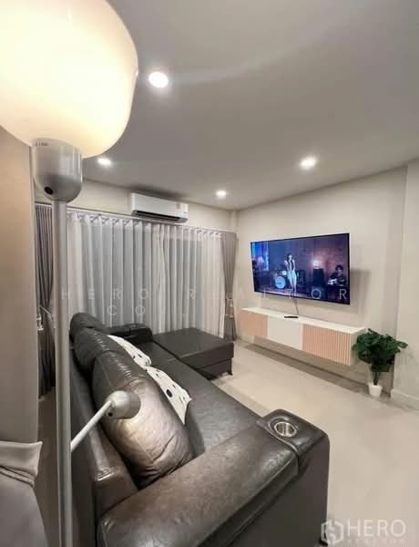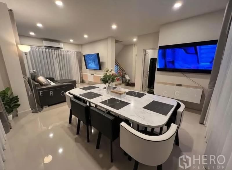 มีการติดตั้งไฟ Recessed Lighting และเครื่องปรับอากาศ พร้อม ทีวีติดผนังและโซฟาขนาดใหญ่ ส่วนโต๊ะอาหารดีไซน์ทันสมัยสามารถรองรับได้ประมาณ 6 ที่นั่ง เหมาะสำหรับการใช้เวลาร่วมกันของครอบครัว
