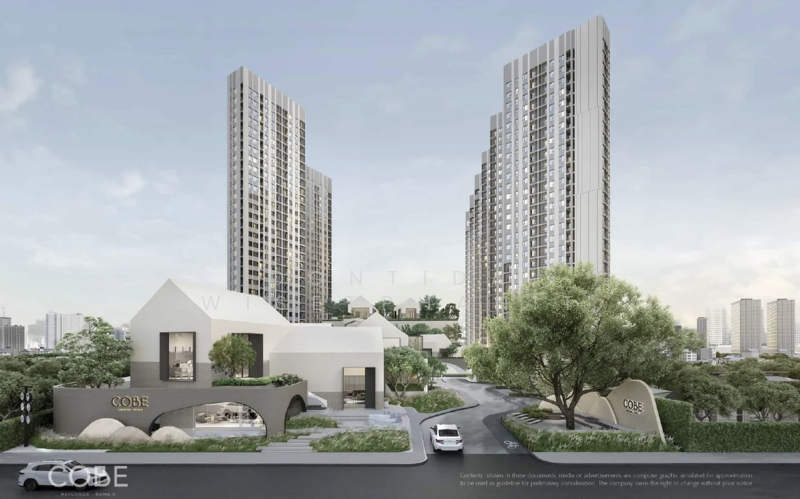 โค้บบ์ รัชดา-พระราม 9 (COBE Ratchada-Rama 9) โครงการคอนโดมิเนียมบนทำเลใกล้รถไฟฟ้าสายสีน้ำเงิน สถานีศูนย์วัฒนธรรมแห่งประเทศไทย ประมาณ 2.8 กิโลเมตร เป็นผลงานการพัฒนาโครงการจากบริษัท เอสซี แอสเสท คอร์ปอเรชั่น จำกัด (มหาชน) โครงการนี้มีเนื้อที่ทั้งหมดประมาณ 12 ไร่ 2 งาน 69.9 ตารางวา จำนวน 9 อาคาร โดยมีอาคาร A-I มีความสูง 27 ชั้น และอาคาร G มีความสูง 29 ชั้น รวมทั้งหมด 1,612 ยูนิต มีพื้นที่ใช้สอยตั้งแต่ 23.76-36.89 ตารางเมตร ขนาดห้องสตูดิโอ-1 ห้องนอน 1 ห้องน้ำ พร้อมสิ่งอำนวยความสะดวก เช่น พื้นที่สำหรับสัตว์เลี้ยง, สระว่ายน้ำ, ห้องออกกำลังกาย และระบบรักษาความปลอดภัยได้มาตรฐาน โดยคาดว่าจะแล้วเสร็จทั้งโครงการในปี 2568 และมีลักษณะการถือครองแบบขายขาด ตัวโครงการตั้งอยู่ติดกับถนนเทียมร่วมมิตร ใกล้แหล่งอำนวยความสะดวก โดยในรัศมีไม่เกิน 5.5 กิโลเมตร จะพบสถานที่น่าสนใจ เช่น เอสพลานาด ซีนีเพล็กซ์ รัชดาภิเษก, บิ๊กซีเพลส รัชดาภิเษก, เซ็นทรัลพลาซา พระราม 9, มหาวิทยาลัยหอการค้าไทย, มหาวิทยาลัยเทคโนโลยีราชมงคลตะวันออก วิทยาเขตจักรพงษภูวนารถ, โรงพยาบาลพระรามเก้า และโรงพยาบาลปิยะเวท เป็นต้น นอกจากนี้ผู้อยู่อาศัยยังสามารถเลือกเดินทางเชื่อมต่อจากถนนหน้าโครงการสู่ถนนสายสำคัญใกล้เคียงได้ 3 เส้นทางด้วยกัน คือ ถนนประชาอุทิศ ห่างจากโครงการประมาณ 1 กิโลเมตร ถนนรัชดาภิเษก ห่างจากโครงการประมาณ 2.5 กิโลเมตร และถนนพระราม 9 ห่างจากโครงการประมาณ 2.5 กิโลเมตร และห่างจากโครงการไปประมาณ 5.9 กิโลเมตร จะพบทางพิเศษฉลองรัช สำหรับการมุ่งหน้าทางทิศใต้ จะเชื่อมต่อกับทางพิเศษเฉลิมมหานคร เพื่อไปลงที่เขตบางนา ส่วนการมุ่งหน้าทางทิศเหนือจะไปลงที่เขตลาดพร้าว เขตบางเขน และเขตสายไหม โค้บบ์ รัชดา-พระราม 9 (COBE Ratchada-Rama 9) มีแนวคิดในการออกแบบโครงการ คือ Valleys & Hills เน้นการสร้างสิ่งแวดล้อมที่ดี เพื่อความสุขสบายทางร่างกายและจิตใจที่เกิดจากการพักผ่อนอย่างแท้จริง ท่ามกลางสังคมคุณภาพ ที่ทางโครงการได้จัดให้มีอาคารที่อยู่อาศัยมากถึง 9 อาคาร เพื่อกระจายผู้อยู่อาศัยไม่ให้เกิดความแออัด รวมไปถึงการสร้างพื้นที่ส่วนกลางขนาดใหญ่ เพื่อรองรับการพักผ่อนของทุกครบครัว นอกจากนี้ทางโครงการยังได้เปิดขายห้องพักอาศัยแบบ Fully Furnished ที่ตกแต่งเฟอร์นิเจอร์สไตล์โคซี่ เน้นความโค้งมนและโทนสีอ่อน เพื่อให้เกิดความผ่อนคลายในการอยู่อาศัย พร้อมแบบห้องให้เลือกหลายหลาย โดยแบบห้องในโครงการมีดังต่อไปนี้ Studio พื้นที่ใช้สอย 23.76-25.76 ตารางเมตร พร้อม 1 ห้องน้ำ Studio High Ceiling พื้นที่ใช้สอย 36.2 ตารางเมตร พร้อม 1 ห้องน้ำ 1 BR พื้นที่ใช้สอย 32.02-33.10 ตารางเมตร ขนาด 1 ห้