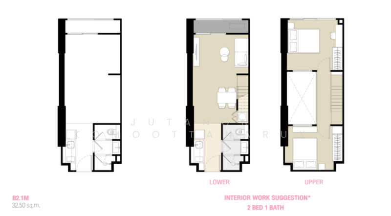 - 2 ห้องนอน ( ชั้นล่าง 32.5 ตร.ม. / ชั้นบน 24.5 ตร.ม. )