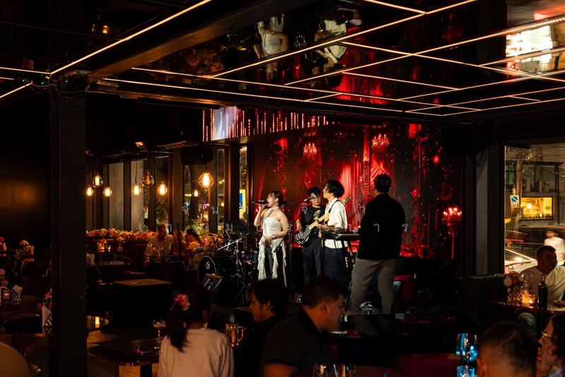 มีเวทีสำหรับการแสดงดนตรีสด พร้อมกลองชุดและอุปกรณ์การแสดงครบ