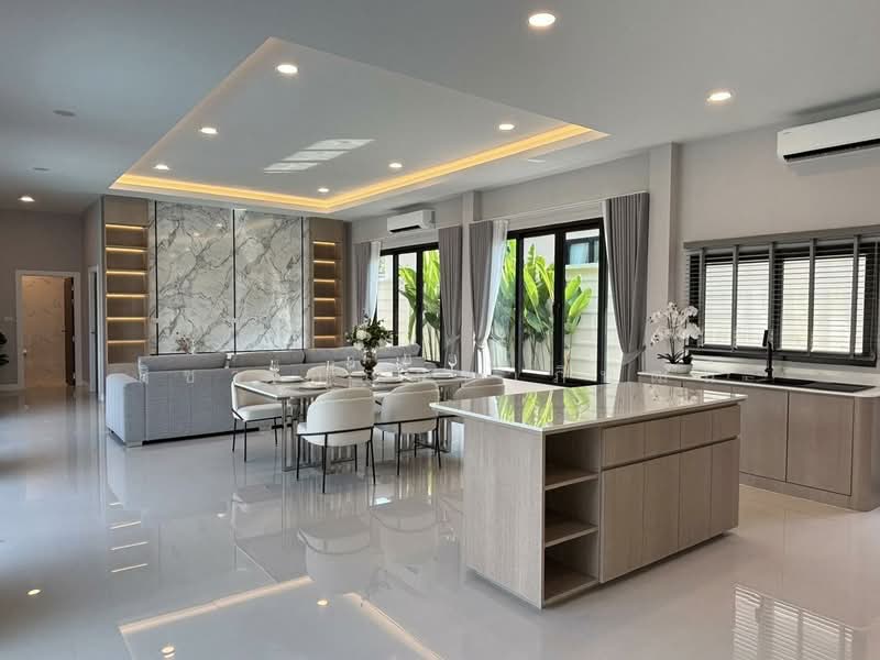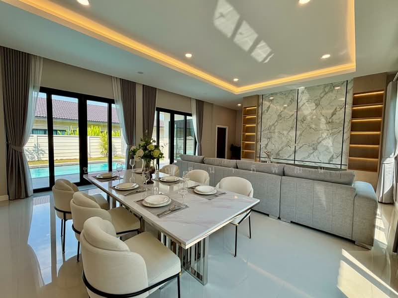 พื้นที่ส่วนกลางของบ้านเชื่อมต่อระหว่างห้องนั่งเล่น ห้องรับประทานอาหาร และพื้นที่ภายนอกได้อย่างกลมกลืน เปิดมุมมองสู่สระว่ายน้ำส่วนตัวภายในบ้าน เหมาะสำหรับการพักผ่อน ใช้ชีวิตประจำวัน หรือรองรับกิจกรรมของครอบครัว บ้านตกแต่งพร้อมเฟอร์นิเจอร์ครบครัน เลือกใช้วัสดุและการจัดวางที่เน้นความเรียบหรู สามารถเข้าอยู่อาศัยได้ทันทีโดยไม่ต้องปรับปรุงเพิ่มเติม