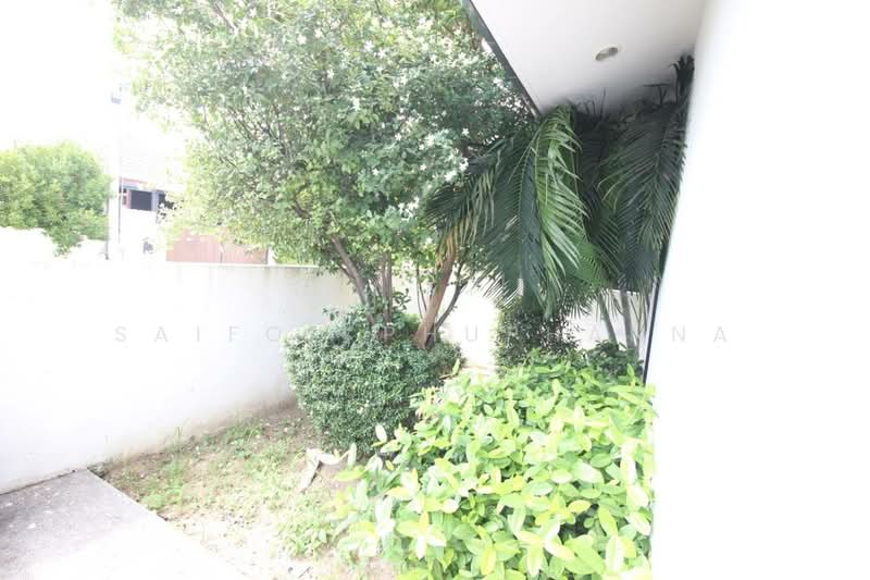บริเวณด้านข้างมีสวนและต้นไม้โตให้ร่มเงา เพิ่มความร่มรื่นและช่วยกรองสายตาจากภายนอก ลานรอบบ้านปูพื้นกระเบื้องและโรยหินตกแต่ง ดูแลง่ายและเหมาะกับผู้ที่ไม่ต้องการสวนที่ดูแลยุ่งยาก แนวกำแพงรอบที่ดินช่วยสร้างความเป็นส