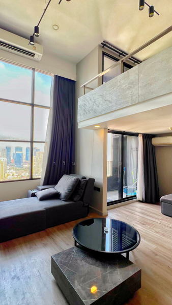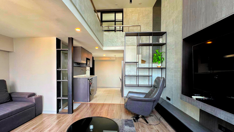 This high-floor duplex unit features double-height ceilings, an open and airy layout, and a true urban loft vibe