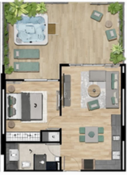 ห้องชุดมีพื้นที่รวม 72.22 ตร.ม. รวมถึง ระเบียงส่วนตัวขนาด 23.85 ตร.ม. พร้อม จากุซซี่ และพื้นที่พักผ่อน ผังห้องออกแบบมาเพื่อการอยู่อาศัยอย่างสะดวกสบาย ประกอบด้วย ห้องนอนแยกเป็นสัดส่วน ห้องนั่งเล่นโปร่งสว่าง ห้องครัวพร้อมอุปกรณ์ครบ พื้นที่แต่งตัว และห้องน้ำสมัยใหม่