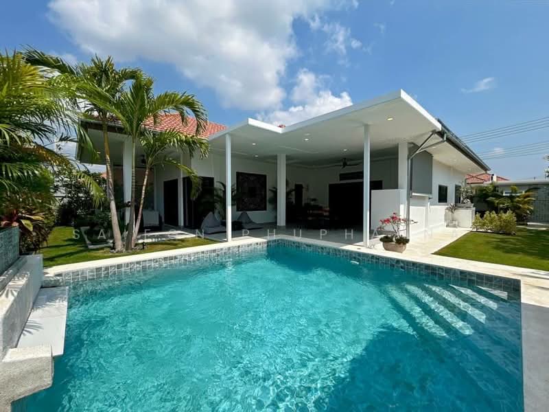 วิลล่าชั้นเดียวสไตล์โมเดิร์นหลังนี้ตั้งอยู่ในโครงการบ้านพักอาศัยเงียบสงบย่านทับใต้ หัวหิน บนที่ดินประมาณ 504 ตารางเมตร พื้นที่ใช้สอยภายในราว 203 ตารางเมตร จัดผังโปร่งโล่งน่าอยู่ ภายในมี 3 ห้องนอน 2 ห้องน้ำ พร้อมเฟอร์นิเจอร์ครบทั้งหลัง สามารถเข้าอยู่ได้ทันทีเหมาะสำหรับอยู่อาศัยระยะยาวหรือเป็นบ้านพักตากอากาศส่วนตัว ตัวบ้านออกแบบเน้นแสงธรรมชาติและบรรยากาศผ่อนคลาย รายล้อมด้วยสวนเขียวและพื้นที่กลางแจ้งหลากหลายมุม