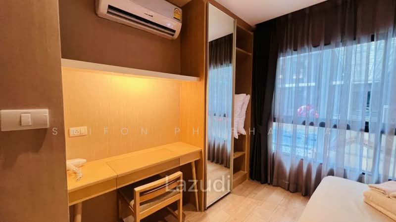 ด้านข้างเตียงติดตั้งหน้าต่างบานใหญ่สูงจรดพื้นพร้อมม่านโปร่งและม่านทึบสองชั้นช่วยควบคุมแสงได้ยืดหยุ่น พื้นห้องเป็นพื้นลายไม้ให้ความรู้สึกเป็นธรรมชาติและทำความสะอาดง่าย ข้างผนังอีกด้านเป็นตู้เสื้อผ้าบิลต์อินบานกระจกเงารวมชั้นวางของเปิดโล่งและโต๊ะทำงานไม้พร้อมเก้าอี้เข้าชุดใช้งานได้ทั้งทำงานและแต่งตัว